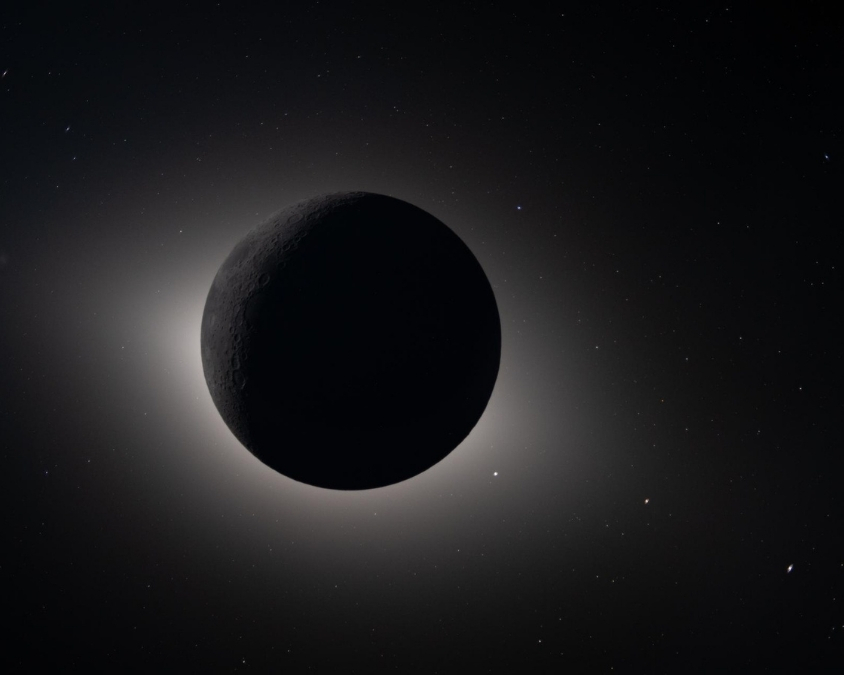 Capturada pela tripulação da Artemis II durante seu sobrevoo lunar em 6 de abril de 2026, esta imagem mostra a Lua eclipsando completamente o Sol. Da perspectiva da tripulação, a Lua parece grande o suficiente para bloquear completamente o Sol, criando quase 54 minutos de totalidade e ampliando a visão muito além do que é possível da Terra. A coroa solar forma um halo brilhante ao redor do disco lunar escuro, revelando detalhes da atmosfera externa do Sol, normalmente ocultos por seu brilho. Também são visíveis estrelas, geralmente muito tênues para serem vistas ao fotografar a Lua, mas com a Lua na escuridão, as estrelas são facilmente observadas. Este ponto de vista único proporciona tanto uma imagem impressionante quanto uma oportunidade valiosa para os astronautas documentarem e descreverem a coroa solar durante o retorno da humanidade ao espaço profundo. O tênue brilho do lado visível da Lua é visível nesta imagem, tendo sido iluminado pela luz refletida da Terra. Crédito: NASA