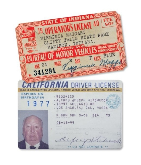 Uma simples licença de papel de Indiana, de 1940, e uma licença da Califórnia pertencente a Alfred Hitchcock que foi vendida por US$ 8.125 em um leilão de Las Vegas em 2008. Wiki Commons (2)