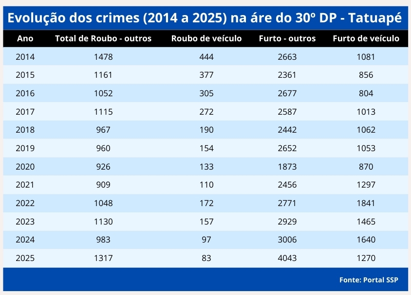 A evolução dos indicadores do 30º DP – Tatuapé (2014–2025) mostra que: