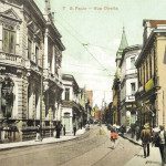 O antigo Viaduto do Chá em 1910; à direita, o Teatro São José, demolido em meados da década de 1920 para a construção do prédio Alexander Mackenzie; ao fundo, à direita, o Grande Hotel Rotisserie Sportsman, um dos primeiros hotéis de luxo da cidade que deu lugar ao edifício que hoje abriga a Prefeitura de São Paulo; e à esquerda do viaduto, o Automóvel Clube, demolido.