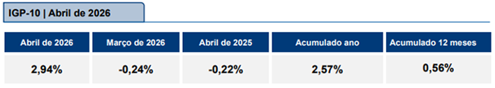 O Índice Geral de Preços – 10 (IGP-10) registrou alta de 2,94% em abril de 2026, segundo dados divulgados pela Fundação Getulio Vargas (FGV). O resultado marca uma forte reversão em relação a março, quando o índice havia caído 0,24%.