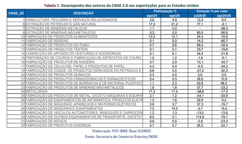 A Tabela 1 mostra a participação do segmento da CNAE (Classificação Nacional de Atividades Econômicas) nas exportações para os Estados Unidos em agosto de 2024 e de 2025. Depois, a variação entre os meses de julho e de agosto desses mesmos anos. Dos 26 segmentos analisados, 18 registraram variação positiva entre os meses de julho de 2024 e 2025 e todos experimentaram queda ou desaceleração na comparação da variação de julho com a dos meses de agosto. Comparam-se os mesmos meses para evitar efeitos sazonais.