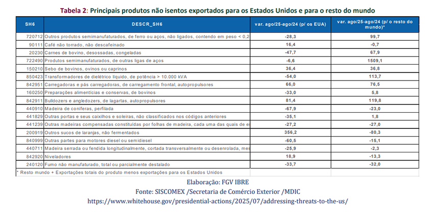 A Tabela 2 foi construída a partir da seleção dos 30 principais produtos exportados no acumulado do ano até agosto de 2025. Depois foram selecionados os produtos que não estão isentos do tarifaço. O objetivo é comparar a variação das exportações para os Estados Unidos com a variação para o resto do mundo (exportações totais menos as exportações para os Estados Unidos). Entre os que apresentam queda nas vendas para os Estados Unidos, alguns registraram variações positivas e elevadas (acima de 30%) para o resto do mundo. Estão nesse grupo: outras semimanufaturas de ferro e aço; carne de bovino; produtos semimanufaturados de ferro e aço; e, transformadores. Produtos de madeira e fumo estão entre os que não conseguiram compensar a queda das exportações para os Estados Unidos.