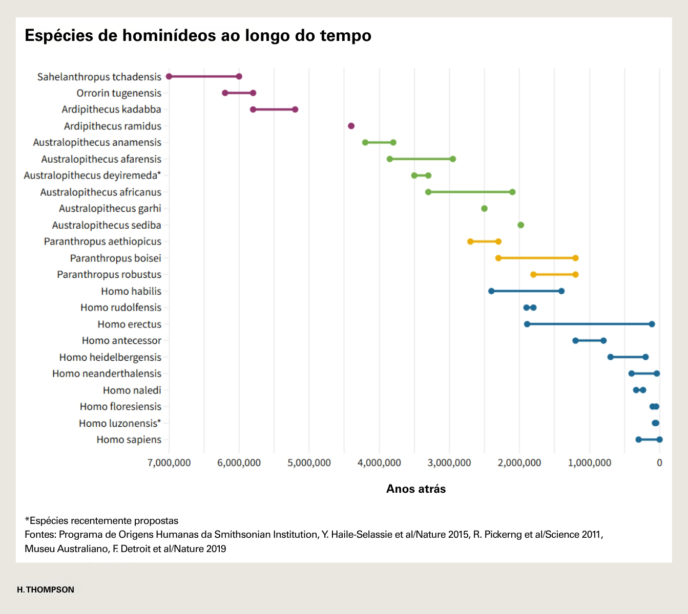 Descobertas fósseis sugerem que muitas espécies de hominídeos viveram nos últimos 7 milhões de anos (as datas para cada espécie são baseadas nessas descobertas), embora os pesquisadores debatam a validade de algumas dessas classificações. Os primeiros hominídeos supostamente existentes (roxo) mostram alguns sinais de locomoção bípede, que se tornou mais comum com o surgimento do Australopithecus (verde). O Paranthropus (amarelo), aparentemente de vida curta, era adaptado para mastigar bastante, e o tamanho do cérebro começou a aumentar nas espécies do gênero Homo (azul).