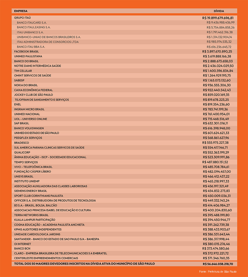 A dívida alcança a cifra bilionária de R$ 56.646.038.218,70. De acordo com a relação divulgada, o Grupo Itaú lidera entre os maiores devedores do município, somando R$ 19.899.679.696,81 bilhões, ou 35,13% do total.