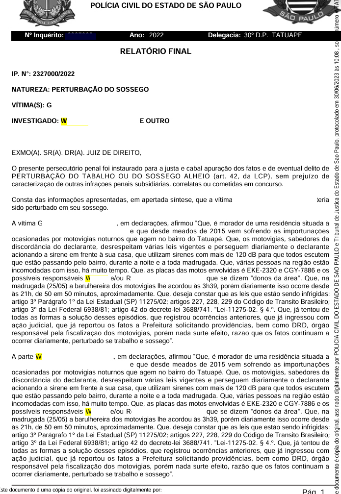 Página de um processo arquivado, envolvendo denúncias de barulho provocado por vigias noturnos no Tatuapé, mesmo com a apresentação de provas consideradas consistentes. O documento final de arquivamento reúne assinaturas de autoridades da Promotoria Criminal do Tatuapé, da Procuradoria-Geral de Justiça do Estado de São Paulo e do 30º Distrito Policial, e registra que o acusado e a vítima residem no mesmo endereço, sendo possível observar que só os nomes foram alterados, mas o texto é o declarado pela vítima. Os nomes completos foram omitidos, mas constam no processo. Foto: Reprodução / aloimage