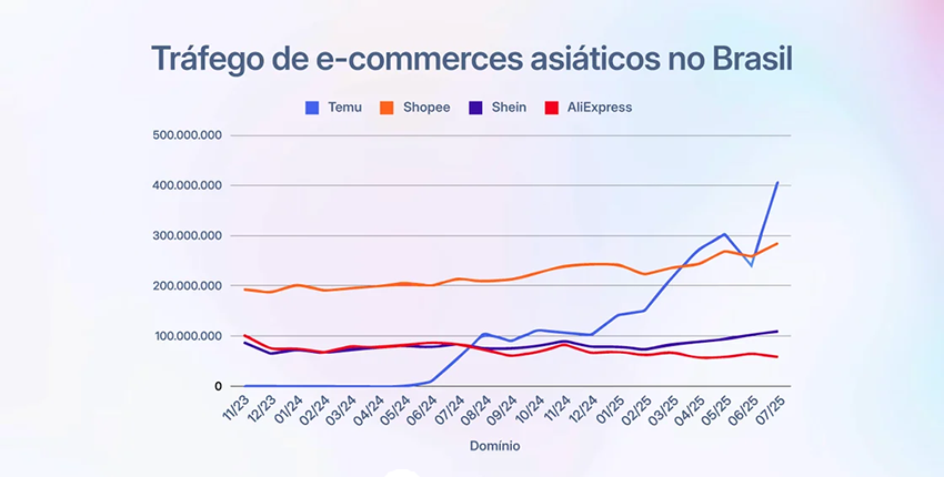 O desempenho da Temu contrasta com o crescimento mais modesto de seus concorrentes estabelecidos. Mercado Livre e Shopee registraram aumento de 10% no mesmo período, ritmo insuficiente para acompanhar a expansão acelerada da nova líder.