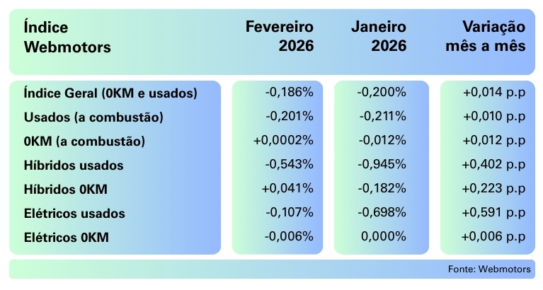 Já os elétricos usados apresentaram recuperação mais expressiva, saindo de uma desvalorização de -0,698% em janeiro para -0,107% em fevereiro, avanço equivalente a +0,591 ponto percentual.
