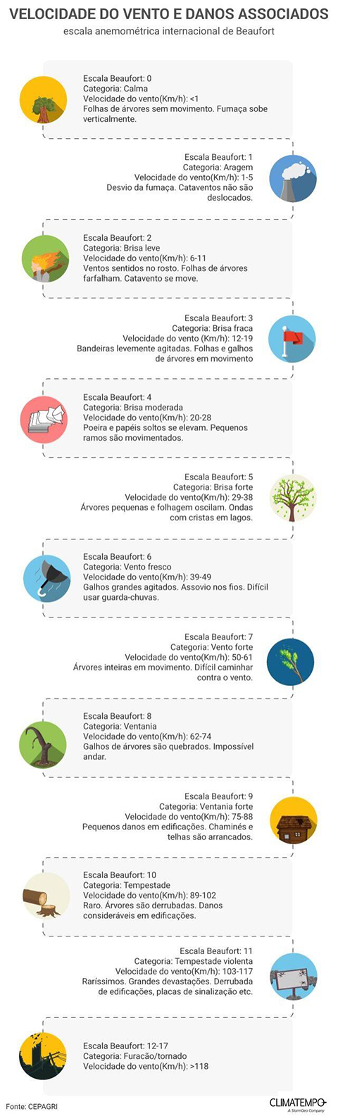 A escala internacional de vento Beaufort ajuda a qualificar o nível de danos com a velocidade dos ventos (Fonte: Climatempo)